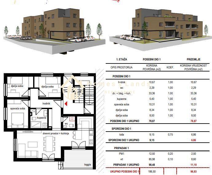 4-soban stan oznake S1 u zgradi MF1 ukupne korisne površine 186,50m2(96,86m2 obračunske površine) sastoji se od hodnika,kuhinje s blagovaonicom,dnevnog boravka,tri spavaće sobe,dvije kupaonice,loggie, prostranog vrta i parkinga.